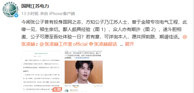 11月5日晚,江苏电力官方微博发文:今闻张公子昔有投身国网之志,方知公子乃江苏人士,曾于金陵专攻电气工程,此缘一见,顿生亲切。鄙人颇具经验(图 1),众人亦有期许(图 2),遂斗胆相邀,公子可愿至吾处体验一日?若有意,可详询本人,愿共探前路,期谱佳话。
